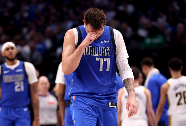达拉斯小牛队的卢卡·东契奇在对阵印第安纳步行者队的比赛中观看比赛。